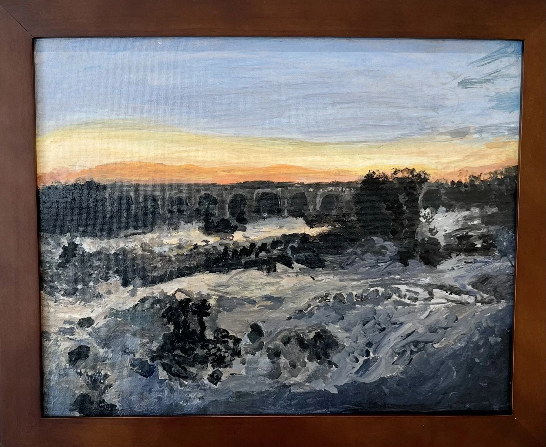 The first of a painting series featuring a scene of the James River during the intervals of blue hour after the sunset. This painting depicts the river scene during the beginning of the blue hour at civil twilight. The sun has just started to set below the horizon, which I depicted by applying the striking values of the sky across the water’s surface. I used a palette knife to paint the ripple texture which remains consistent in the first few paintings of this series where light is clearly defined within the water texture.